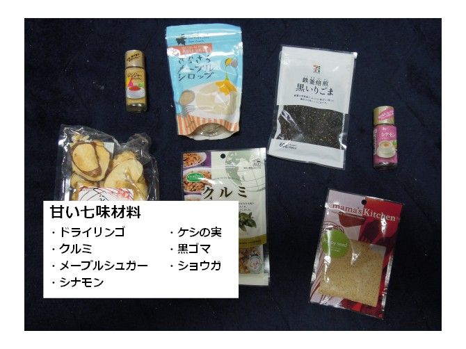 七味と言えば一般にうどんにかけたりする辛いものですが、甘い七味を作ることはできないでしょうか。スイーツをより美味しくする七味です。そして、体にいい七味も作れれば、何を食べても体にいいものになります。 そこで、実際に調合して、美味しいものをより美味しくしてくれる、新たなる七味を作ってみました。