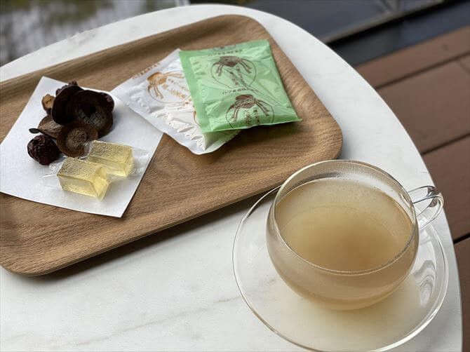 ひと口サイズの寒天ゼリーと2種類の生姜湯が客室やロビーに用意されています。